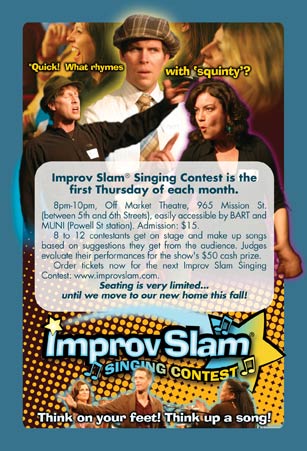 The first is the front and back side of a postcard I designed for an improv singing competition for which I designed a logo and other marketing materials. The design uses an effect that I frequently like to incorporate in designs if appropriate. The effect is that the front of the postcard layout seems to be seen in reverse through the back of the postcard, as if the paper were slightly transparent. The trick is simply to print a ghosted or faded and flopped version of the design, that is on the front, behind the fully opaque artwork that is seen on the back. It adds a sense of 3-dimensions and tends to be more fun than just putting more information on the back of a layout.